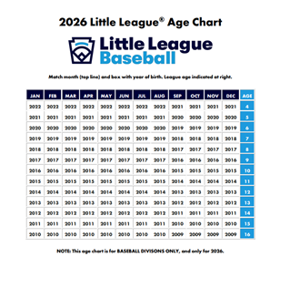 Age Chart: 2026 Little League Age ChartAge Calculator: https://www.littleleague.org/play-little-league/determine-league-age/